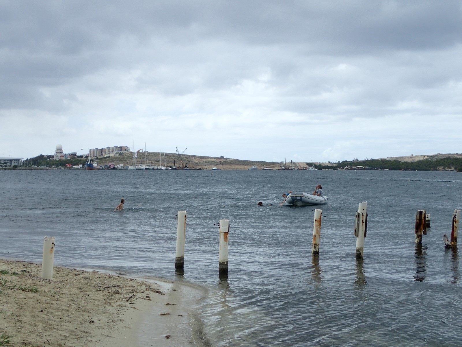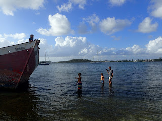 | Rainy days are for bus rides to town! Safely tucked away in the mooring field we didn't realize just how rough the weather was until we had to dinghy on the "outside" to get to the bus stop. It was a wild ride and we got soaked by rain and waves. All that for groceries! |