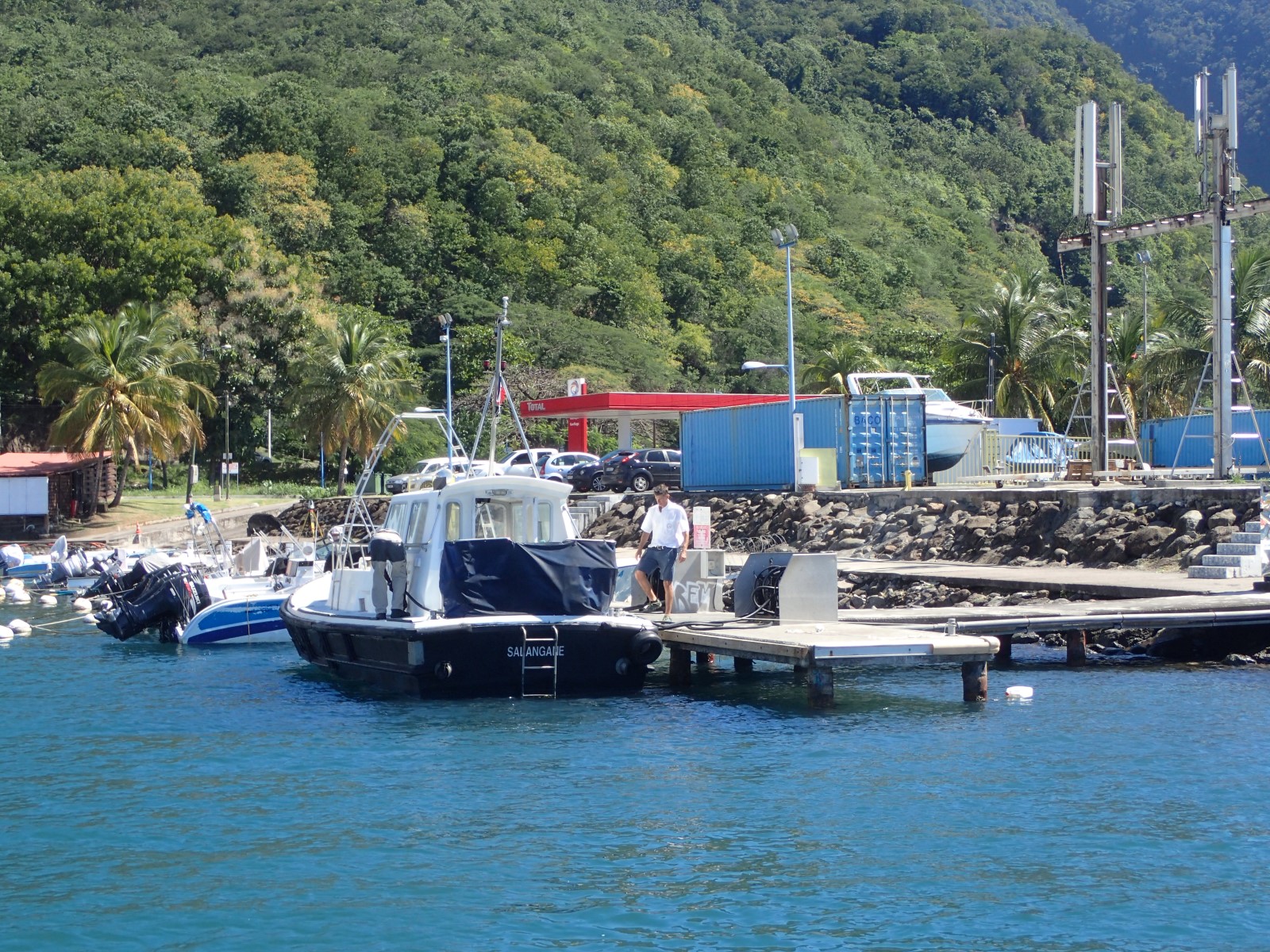 | Thankfully the trip south to Portsmouth, Dominica was relatively short because the wind was honking right up our noses! We sailed a little off course to go fast and then motored into 30knots coming in to the bay. As expected we were met by one of the members of PAYS: Portsmouth Area Yacht Association. This is an organized group of guys who divvy up their services amongst the boaters. One boat will come out to greet you and then work with you to arrange tours and get services. It's a well-run organization and keeps the harbor feeling safe. Some people like it, others feel like it's just another way to part with lots of cash. Titus (who works with Lawrence of Arabia - they all have great names) came out to greet us and helped us get a mooring ball. |