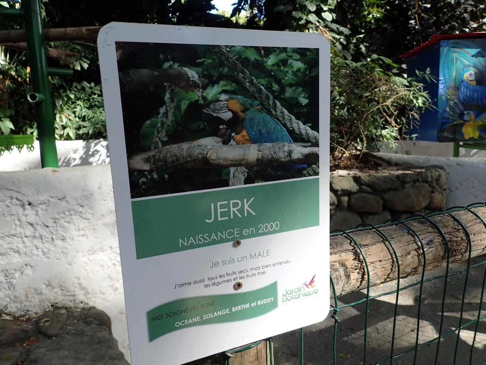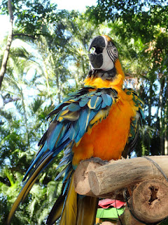 | The macaws had a large shady area, funky caribbean colorful houses to roost in and lots of ropes and branches to climb. |