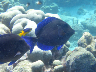 | This is a cleaning station. The Surgeonfish came in and the Damselfish cleaned the parasites off of them. |