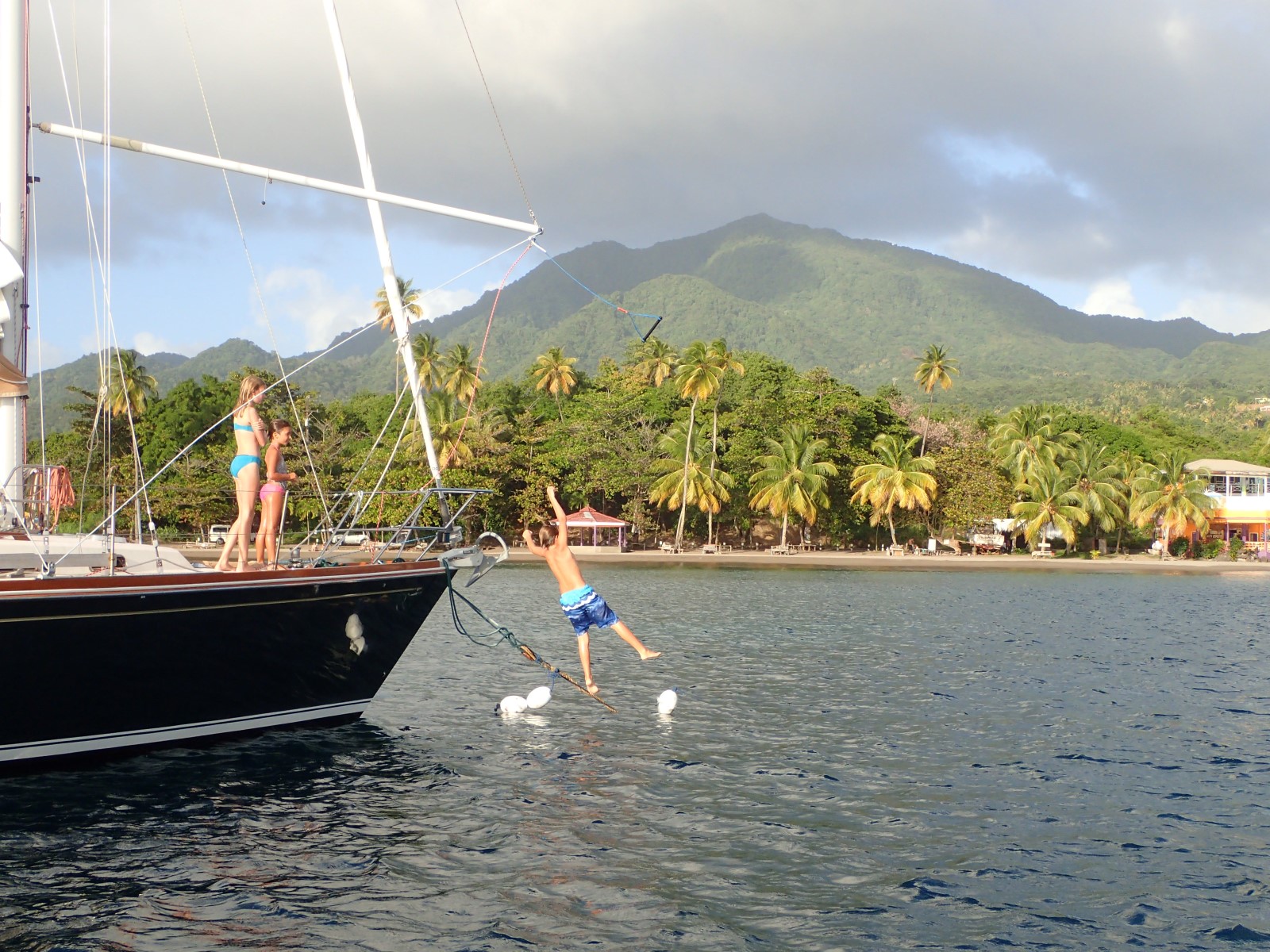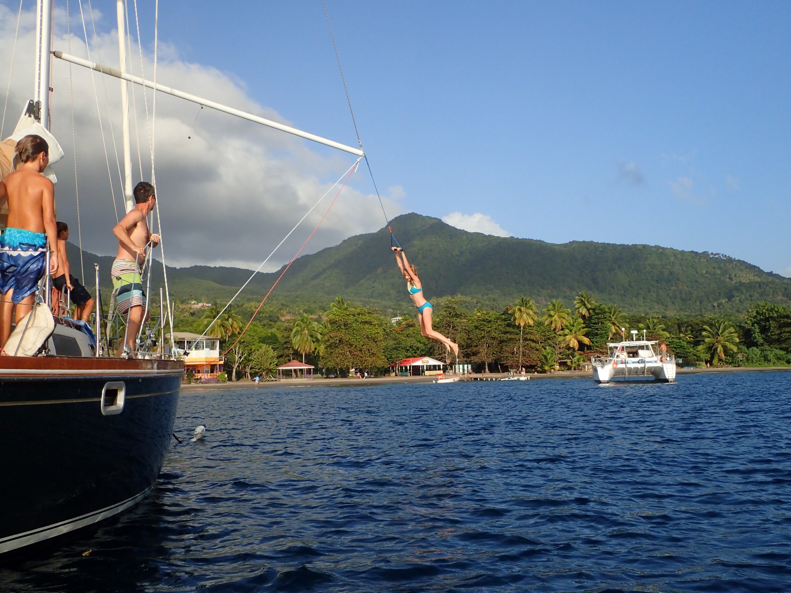 | Then the kids went over to Salmagal and had a blast swinging from their spinnaker pole. |