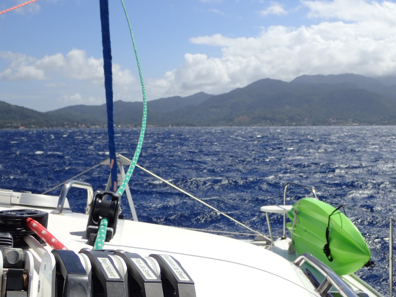 | Thankfully the trip south to Portsmouth, Dominica was relatively short because the wind was honking right up our noses! We sailed a little off course to go fast and then motored into 30knots coming in to the bay. As expected we were met by one of the members of PAYS: Portsmouth Area Yacht Association. This is an organized group of guys who divvy up their services amongst the boaters. One boat will come out to greet you and then work with you to arrange tours and get services. It's a well-run organization and keeps the harbor feeling safe. Some people like it, others feel like it's just another way to part with lots of cash. Titus (who works with Lawrence of Arabia - they all have great names) came out to greet us and helped us get a mooring ball. |