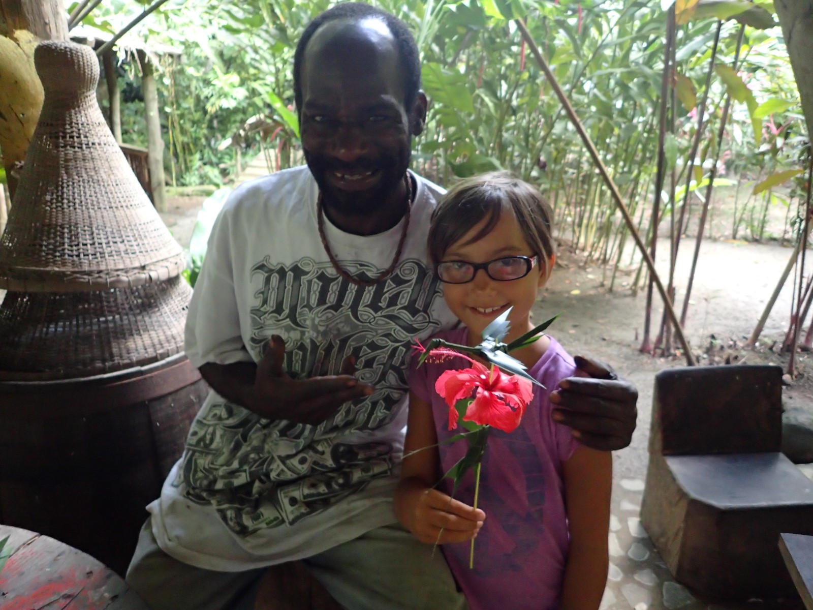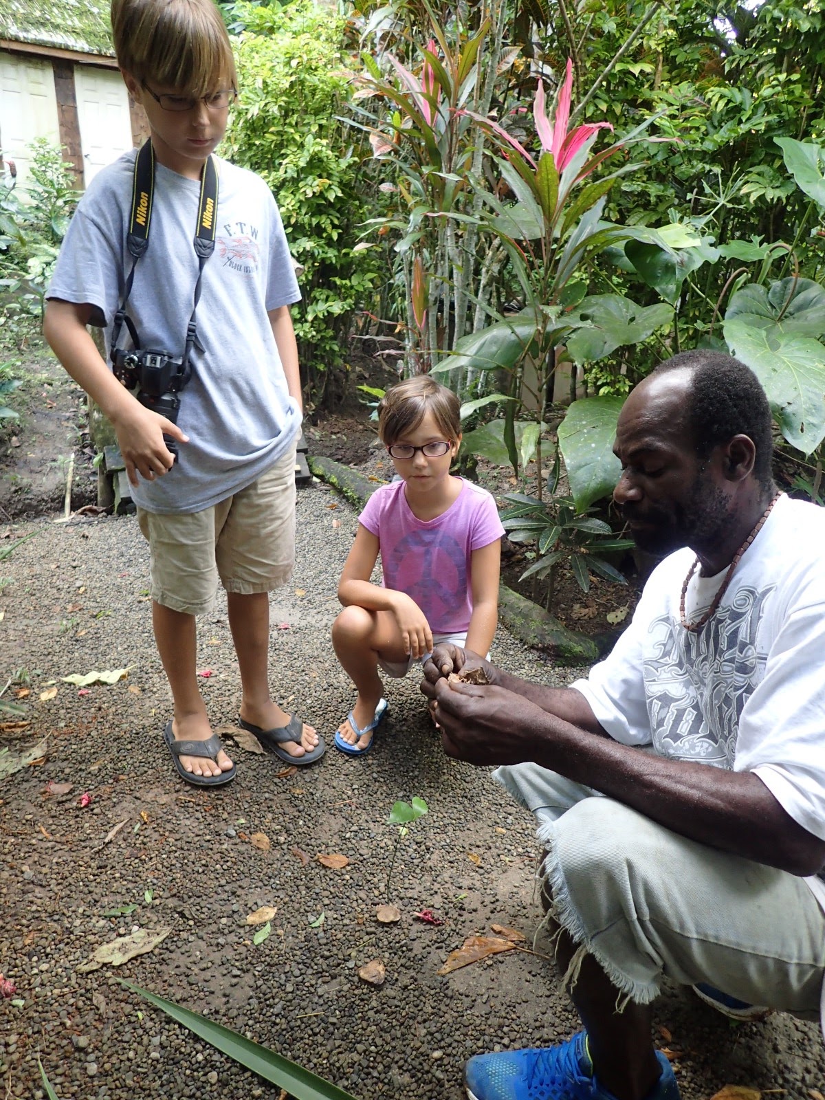 | James showing the kids some plants. The river tour ends at a hidden bar in the jungle. Even though it was 9:30 in the morning we indulged in a drink called a hurricane. Two hurricanes, in fact. Whoa! Take me to the river! James had one too and we weren't sure who was going to have to row us all back. |