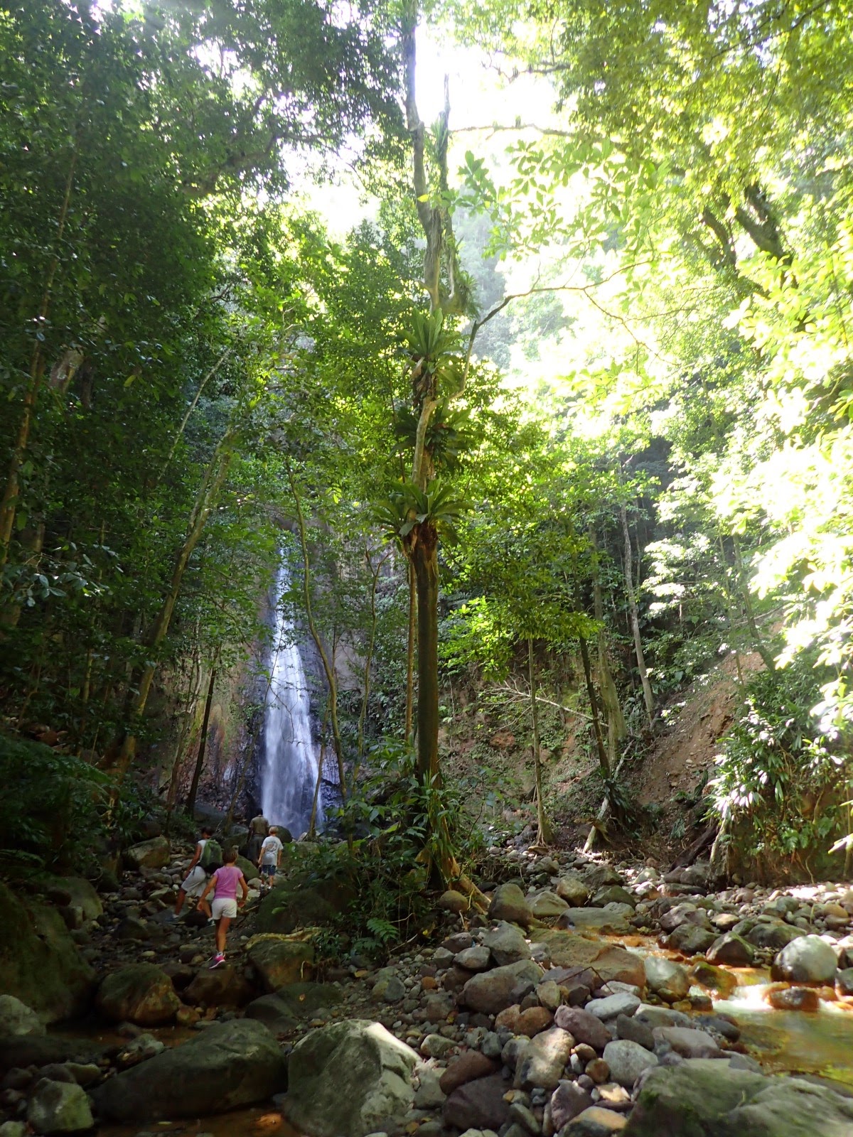 | A little bit of scrambling brought us to the falls. Tropical Storm Erika brought so much rain that a lot of mud and rocks came over the falls and filled in the pool. |