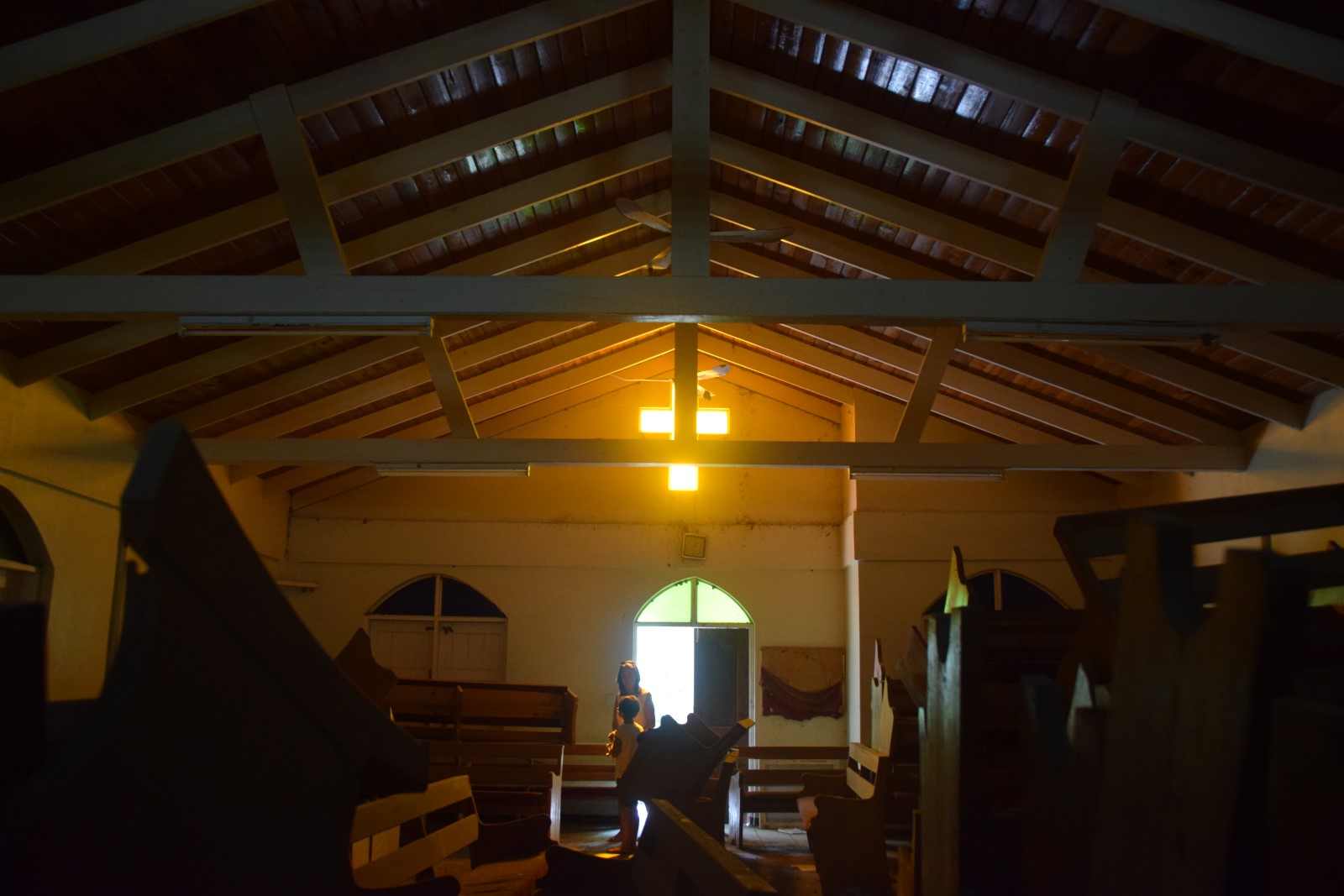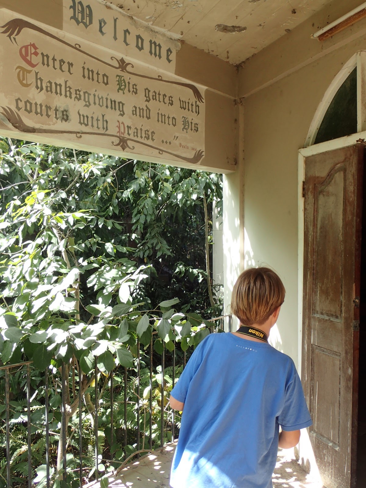 | Inside the church. I believe Drew captured the moment when Cubby found a stuffed bunny face down in the ash and fell apart about it being lonely. So we asked Joe if we could rescue it and he thought it would be ok. Blueberry is now clean and with the rest of the boating bunny family. And as it turns out, Blueberry is part of a video tour of Montserrat on youtube made by our friends we met in Dominica. He is quite the famous bunny. |