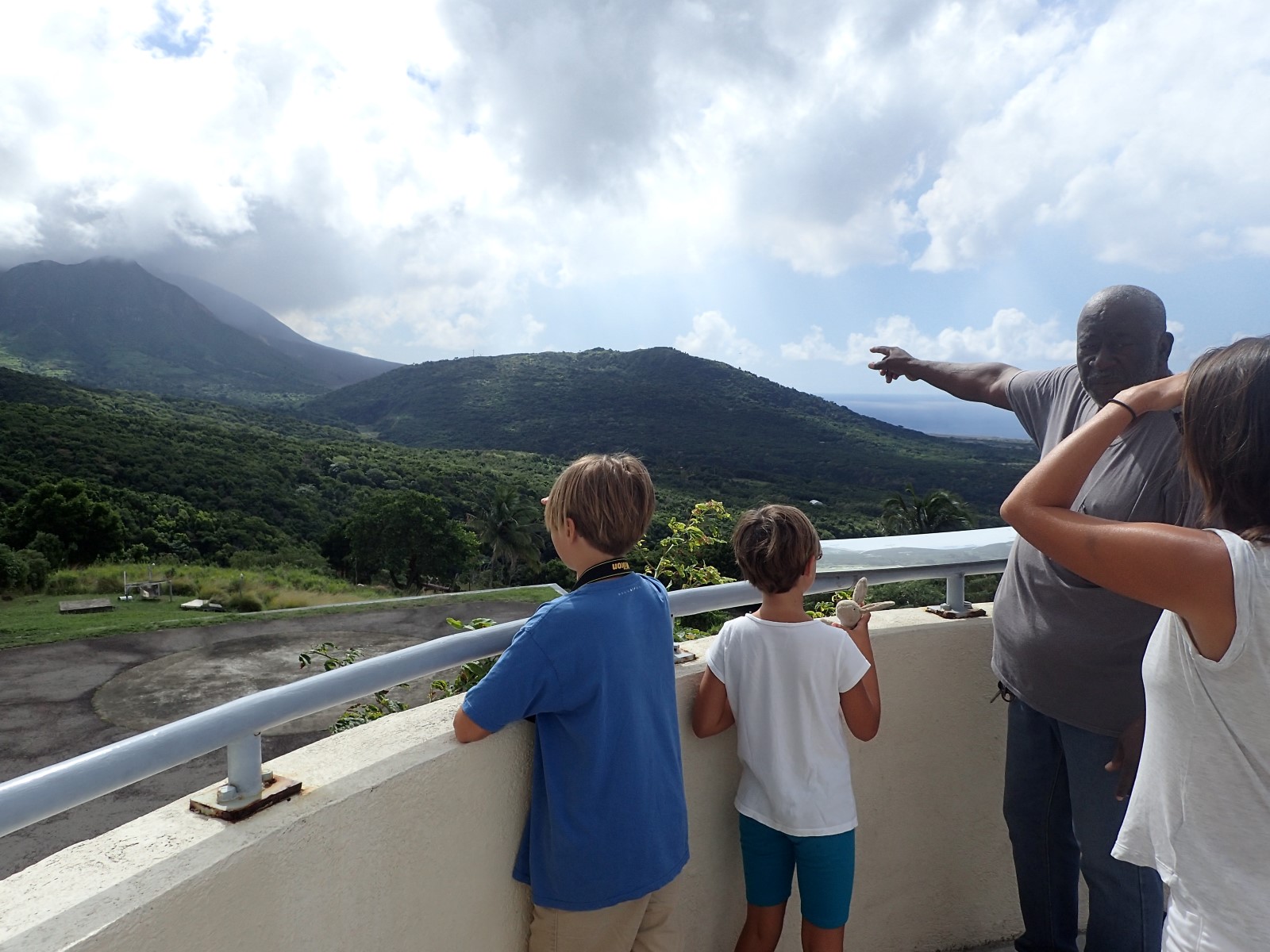 | Our tour guide Joe Phillips pointing out a few things from the observatory where we watched a good film about the volcano. Joe is supposed to be the best guide on the island. If you aren't sure, just ask Joe. I don't know if he's the best but I'm pretty sure he's the most expensive. He did take us through his old neighborhood which you wouldn't even know is there. All the houses are abandoned and so overgrown you can't see them. |