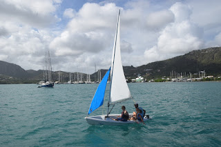 | One of the hoses for our watermaker burst not long after we arrived. This was a major issue since Antigua is experiencing a bad drought so we couldn't even buy water. We ordered new hoses right away and knew we'd be waiting for at least a week for them to arrive. So Andy bought a week membership at the yacht club which meant $20 sailing lessons for Cubby and free use of the dinghys any time. Here's Cubby before her first lesson. |