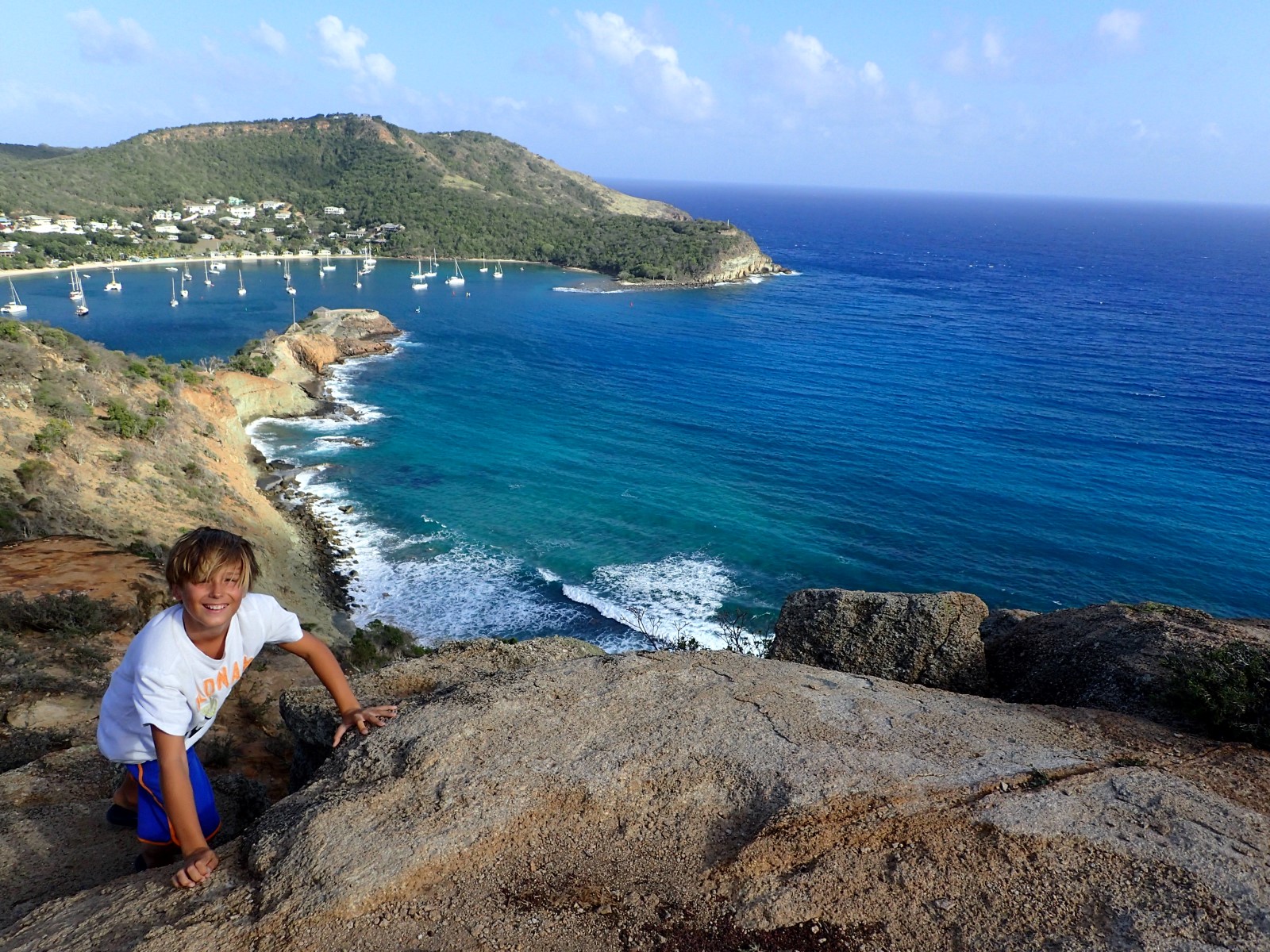 | Andy and Drew hiked up the hill overlooking English and Falmouth Harbours. Isn't it pretty? The girls went around by dinghy and picked them up at the beach on the other side. |