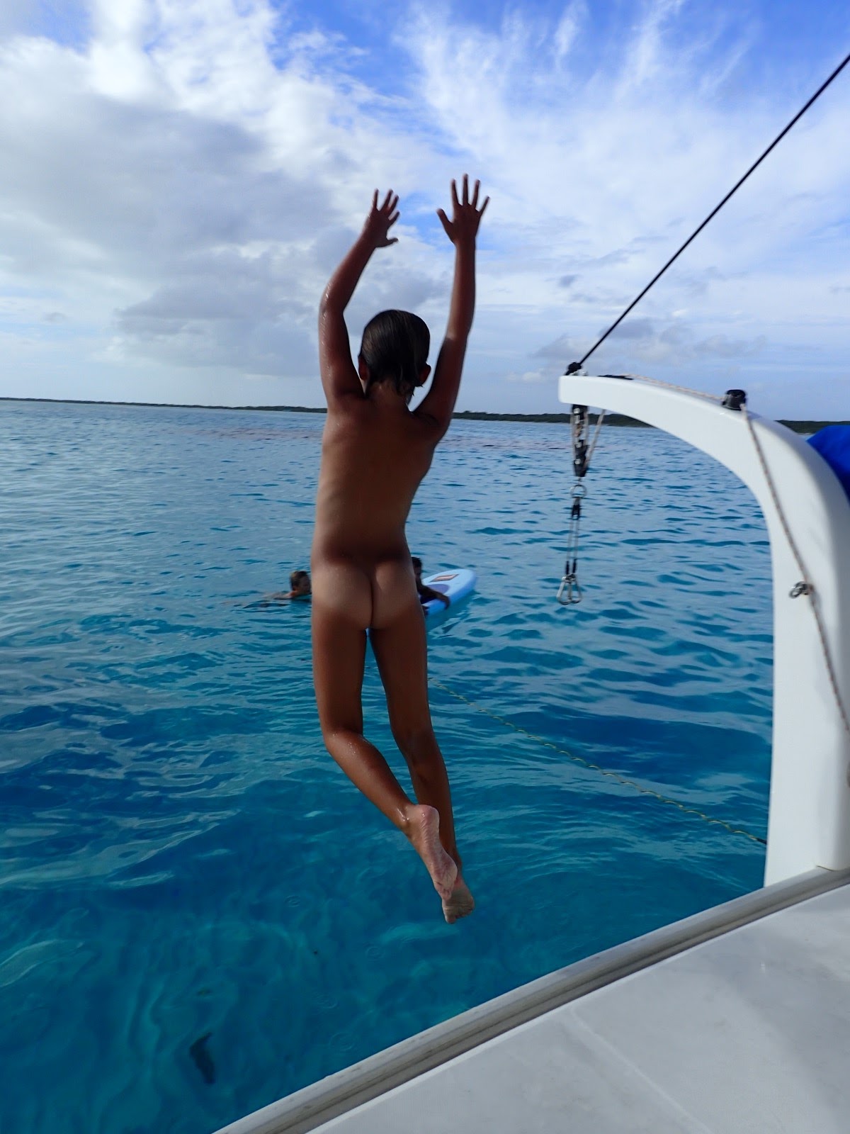 | With a large north swell forecast we decided to anchor off Spanish Point in Gravenor's bay on the remote south side of Barbuda. It's really secluded so we celebrated our arrival with a family skinny dip. We saw so much general boat nudity in Antigua that modesty wentby the wayside. But I still do not understand how men can raise anchor chain in the buff. I don't even like getting my fingers anywhere near the windlass! |