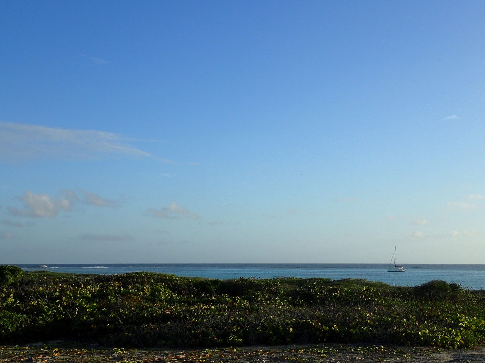 | Tangent at anchor behind the reef. It was so cool watching the waves roll in and crash on the reef while we were in flat calm water. Too bad we arrived here with no money and no phone and the VHF didn't reach anyone on shore. Awesome planning, as usual. |