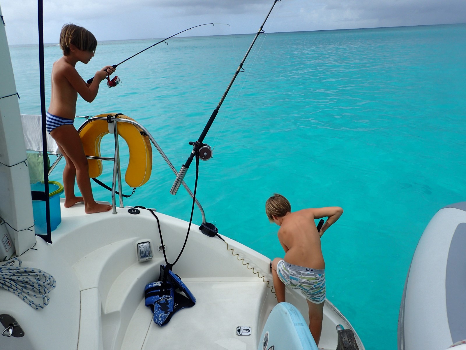 | In the evening two fishermen came by selling freshly caught mahi. We bought some since it's been so long since we've had fresh fish. It would be nice to catch some of our own but this is the next best thing. They were kind enough to give us the head for making soup. Ew. We tied it off the back instead hoping to attract a shark. No luck. |