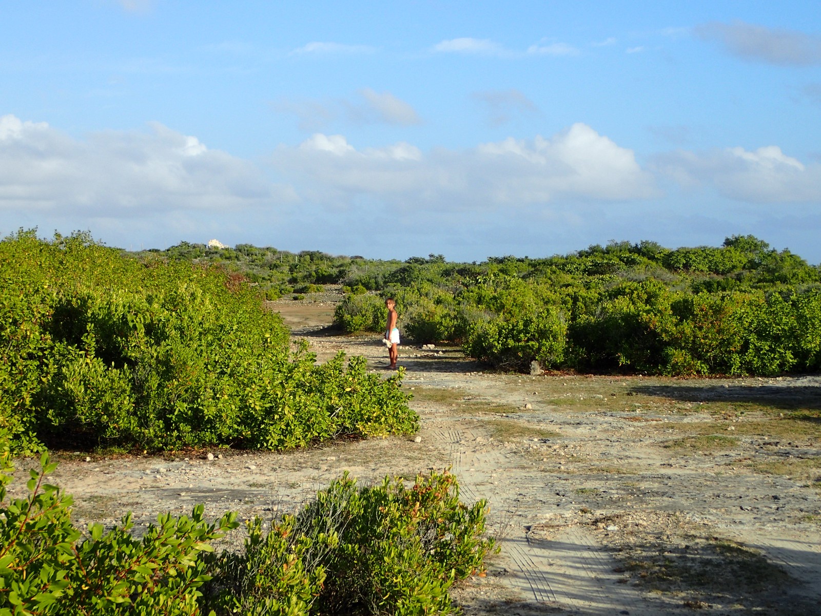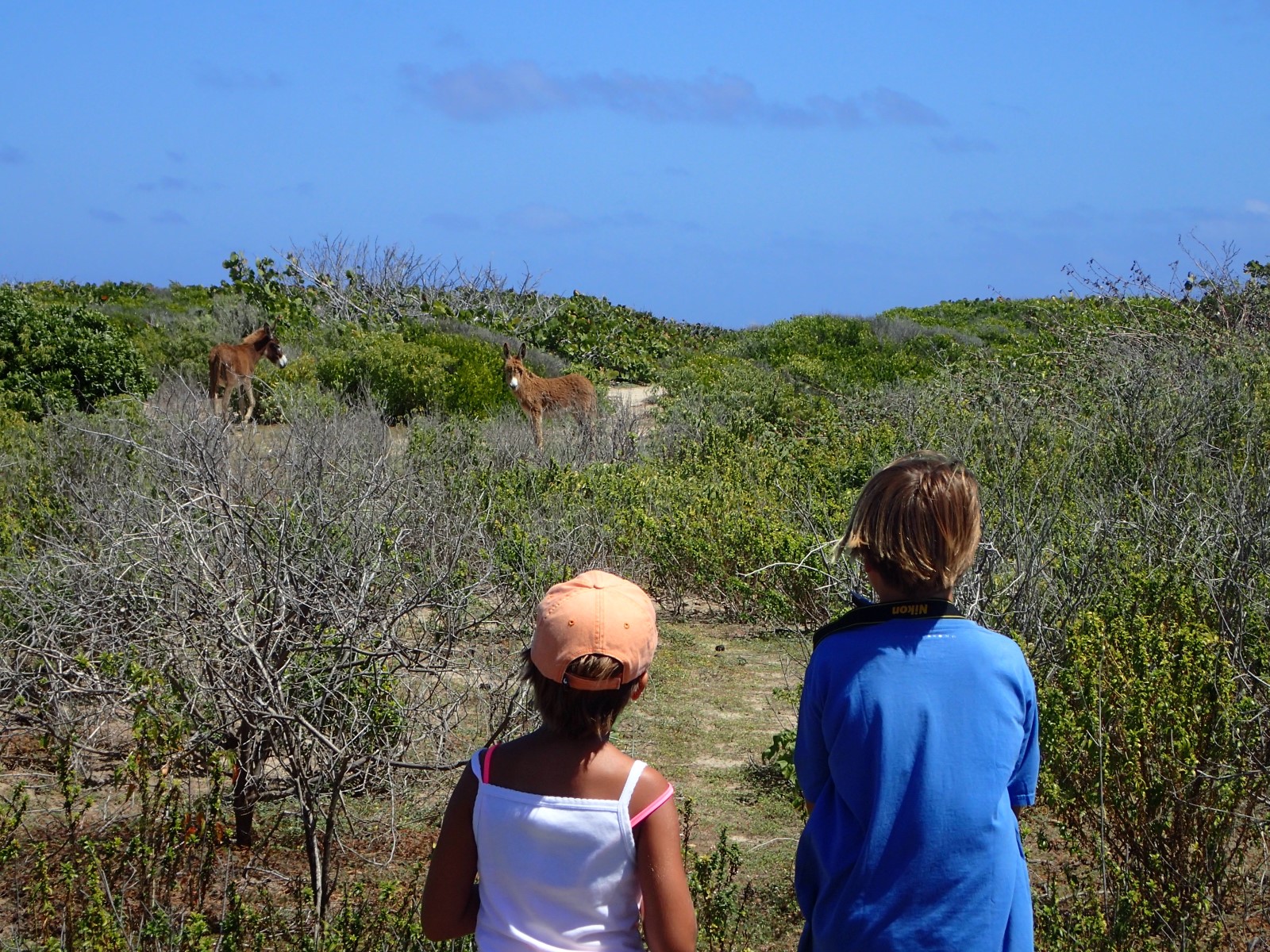 | On a walk in search of wild donkeys Cubby got fed up with the heat and started marching back to the dinghy without us. So of course we hid from her and took her picture just before she started panicking. So nice of us. |