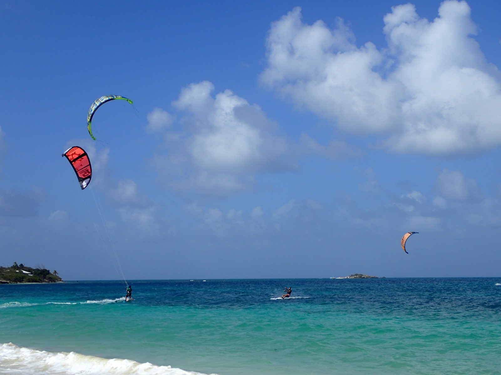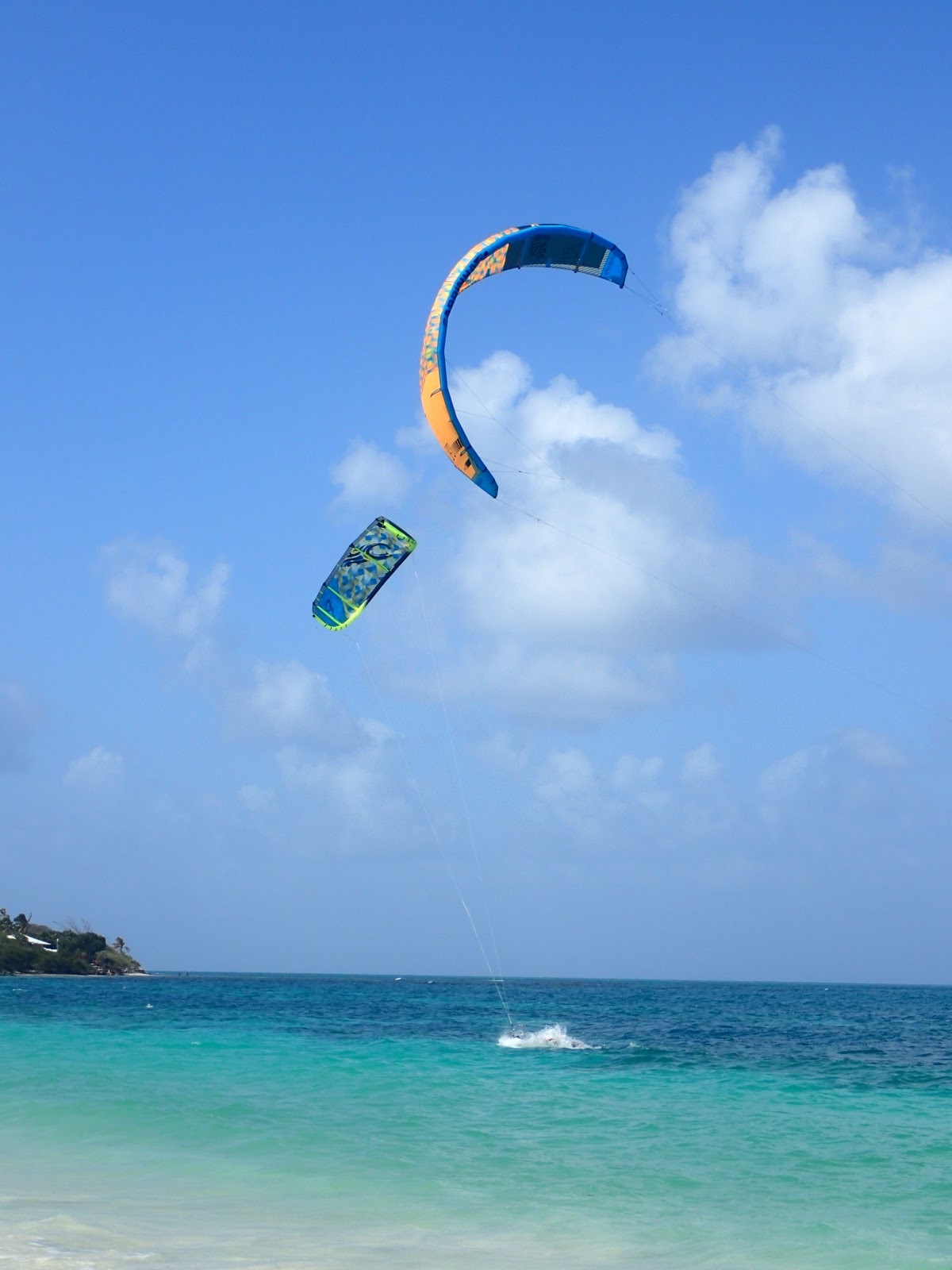 | One of the many reasons we had for turning our trip around early was to try to seek out more kiteboarding spots for Andy. Green Island in Antigua was one of the spots he was really looking forward to. But with the watermaker out of commission we had to stay close to our only source of water - 5 gallon water cooler jug refills that Andy had to lug back and forth from the store every day. We were really rationing. With the disappointment of missing Green Island hanging over him, he researched a different spot and we made an expedition to Jabberwock Beach. It was a pretty good day for it and there he is up and going between the kids and the anchored boat. |
