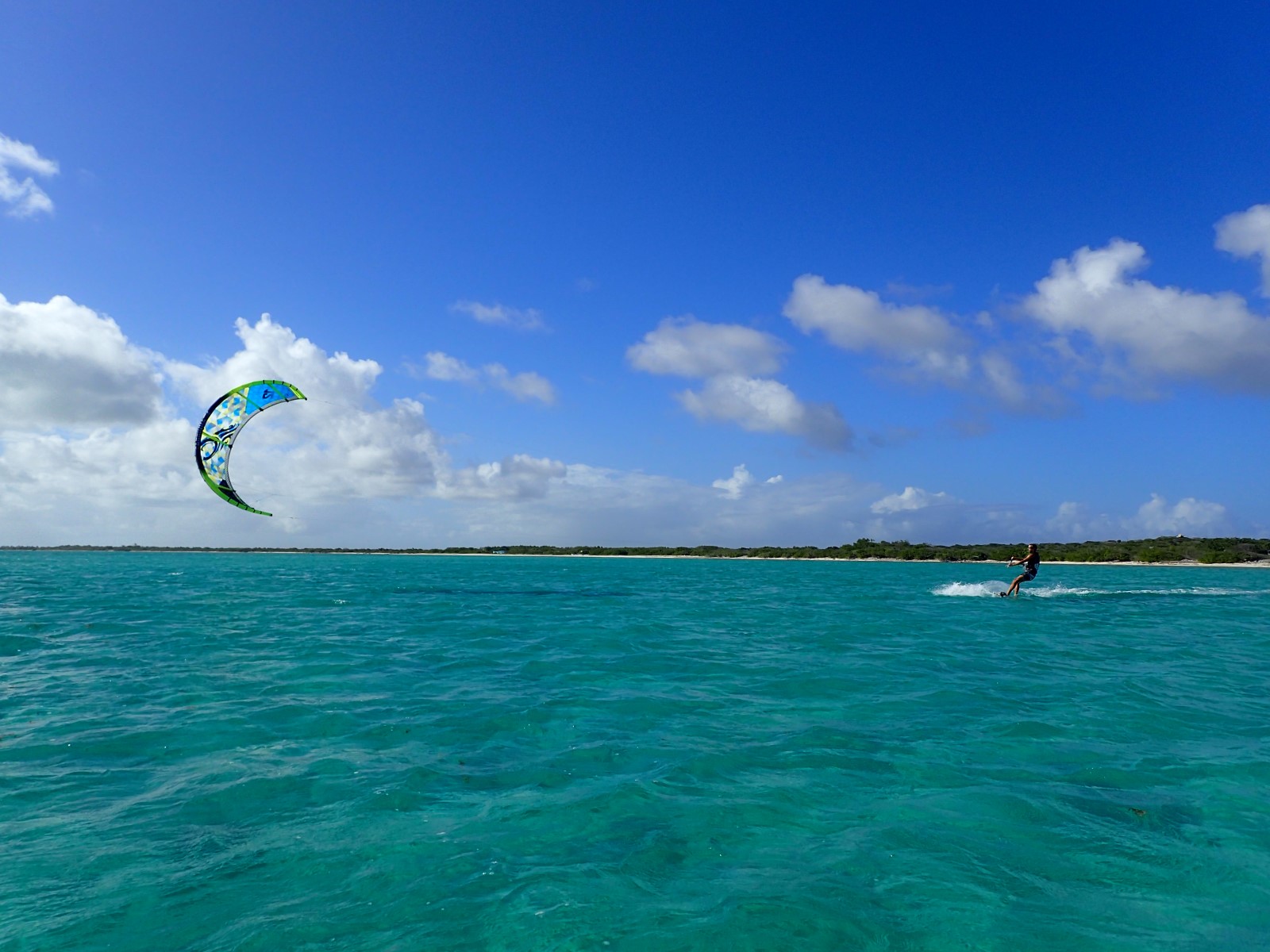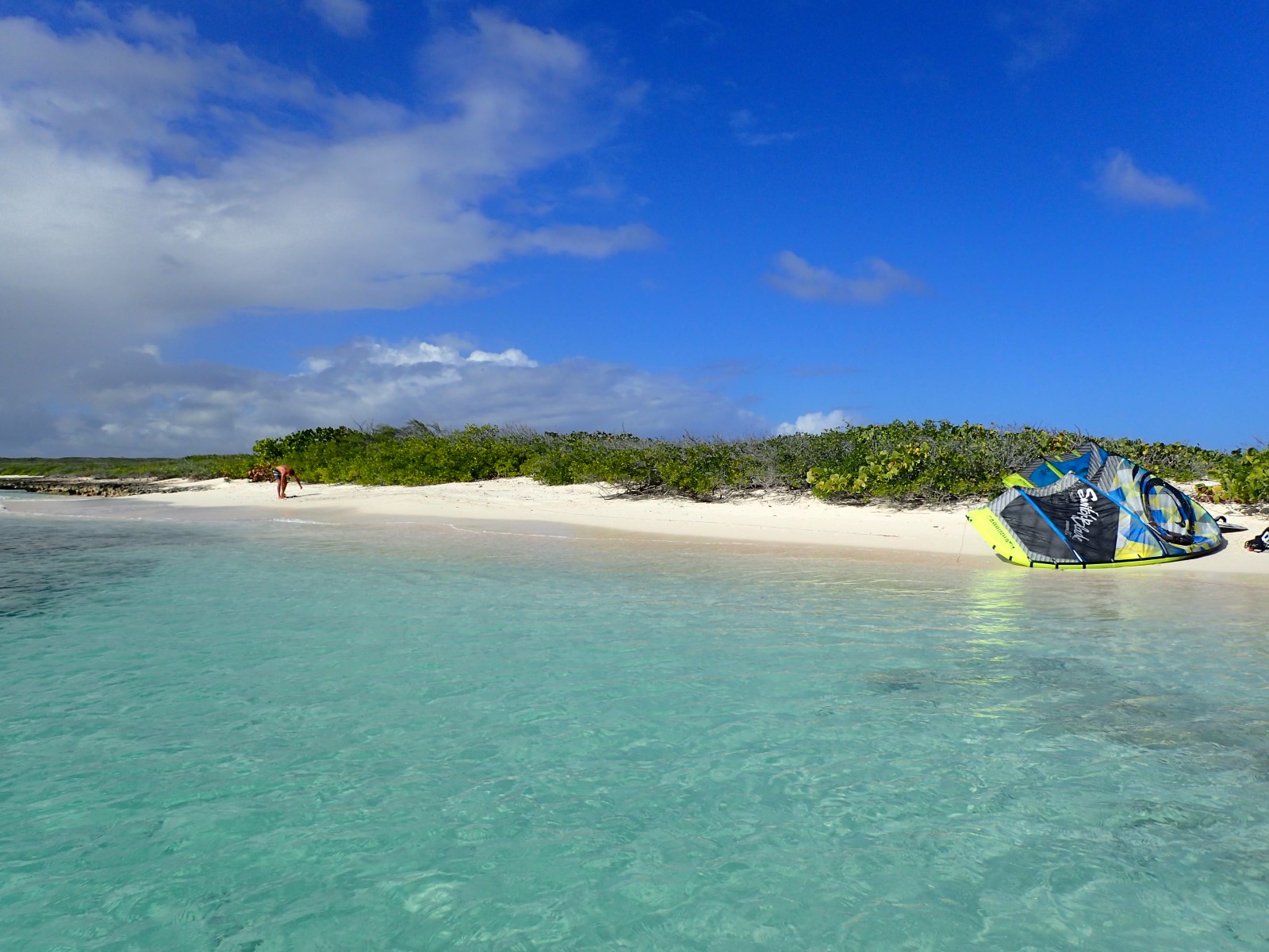 | Andy was hoping to shake off the disappointment of missing out on Green Island by kiteboarding in this perfect spot. But of course the day he wanted to go I hurt my toe so badly that I had to stay off my feet most of the day. He can't catch a kiteboarding break! But when we came back from the donkey walk the conditions were looking good. So I helped him launch and then followed him in the dinghy. Here he is setting up on the beach. |