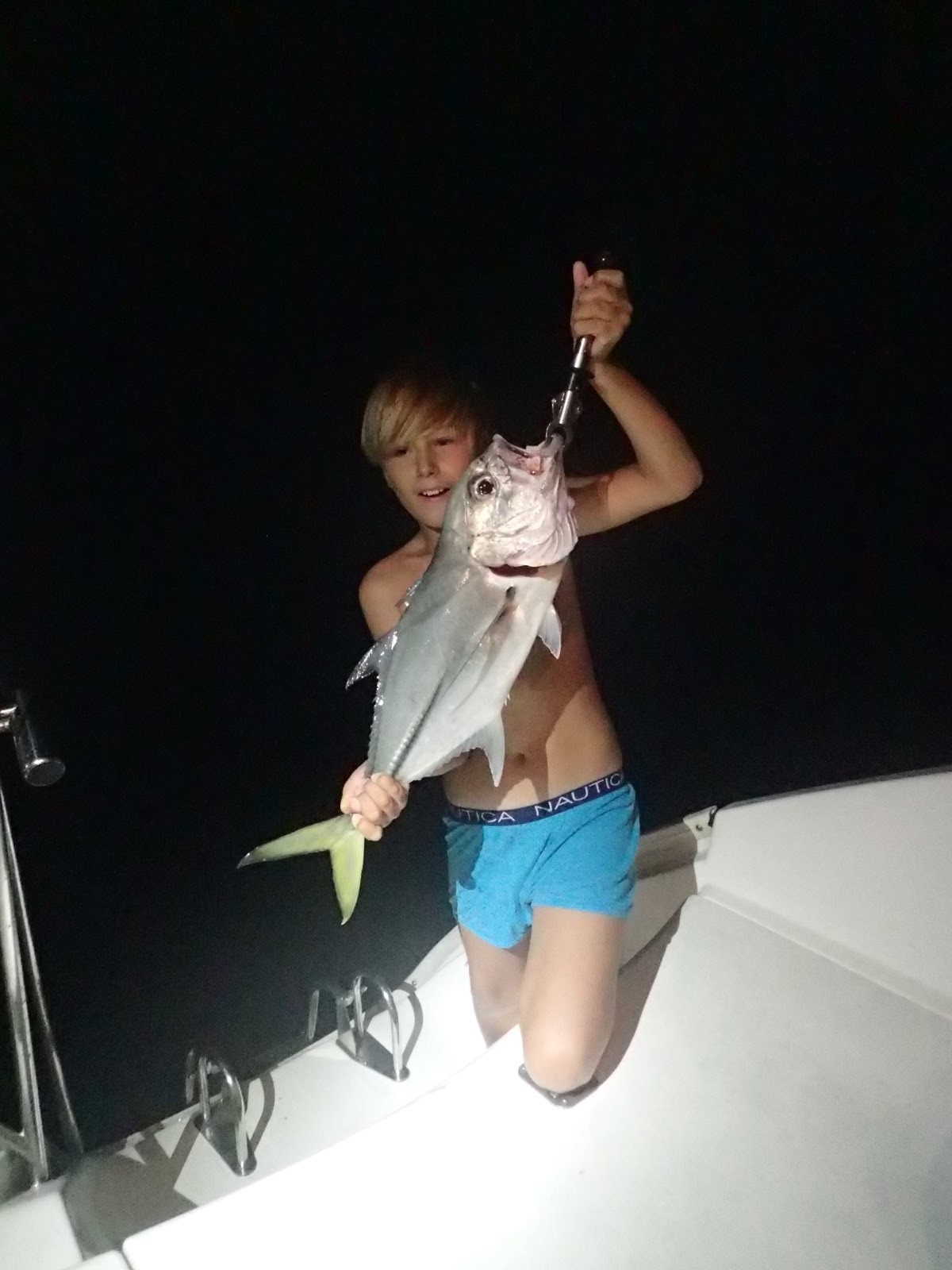 | Drew noticed some big fish feeding around the boat that night. He threw a line in and had an exhilarating fight with this horse-eyed jack. We haven't seen him this thrilled in a long time. It's like fishing is in his blood or something. |